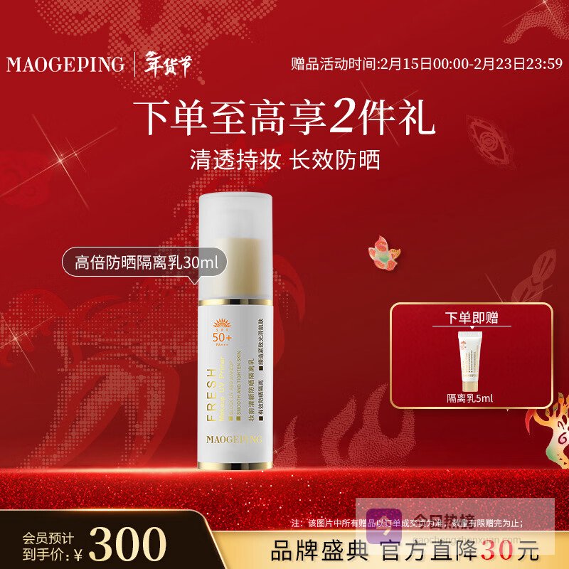 【品牌直营】毛戈平妆前清新防晒隔离乳隔离霜提亮肤色美妆新年情人节礼物妆前清新防晒隔离30ml¥