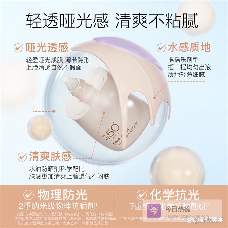 高倍紫外线防护:拥有SPF50+的卓越防晒指数,有效隔离日常紫外线伤害,让肌肤无惧强烈阳光。这款产品设计考虑周全,能够帮助减少肌肤被晒红和晒伤的几率,为日常出行提供可靠护航。无论是日常通勤还是户外活动,都能为肌肤提供贴心守护,保持健康美丽。