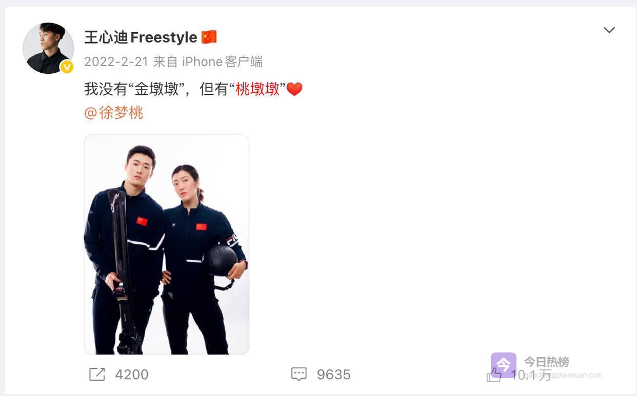 2022年北京冬奥会,徐梦桃在家门口圆梦夺冠。赛后,王心迪在微博上卡点发文:“我没有‘金墩墩’,但有‘桃墩墩’”。徐梦桃秒回:“桃墩墩在这里”。之后,两人步入婚姻殿堂。