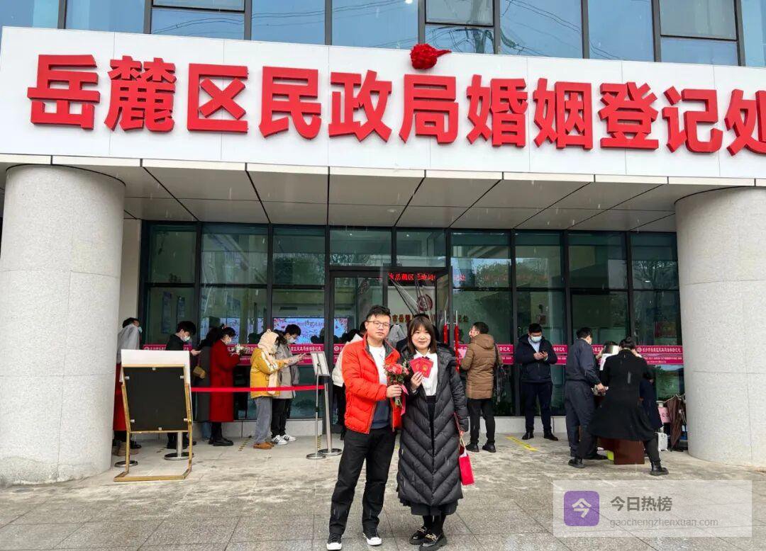 平日岳麓区婚姻登记处约30对/日, 今天网上预约+现场排队已突破270对,预计总量是平时的十倍。为应对高峰,登记处提前分流、一米线、测温验码、资料前置、窗口扩容、午间不停休,还备好红糖姜茶给排队的新人暖手也暖心。