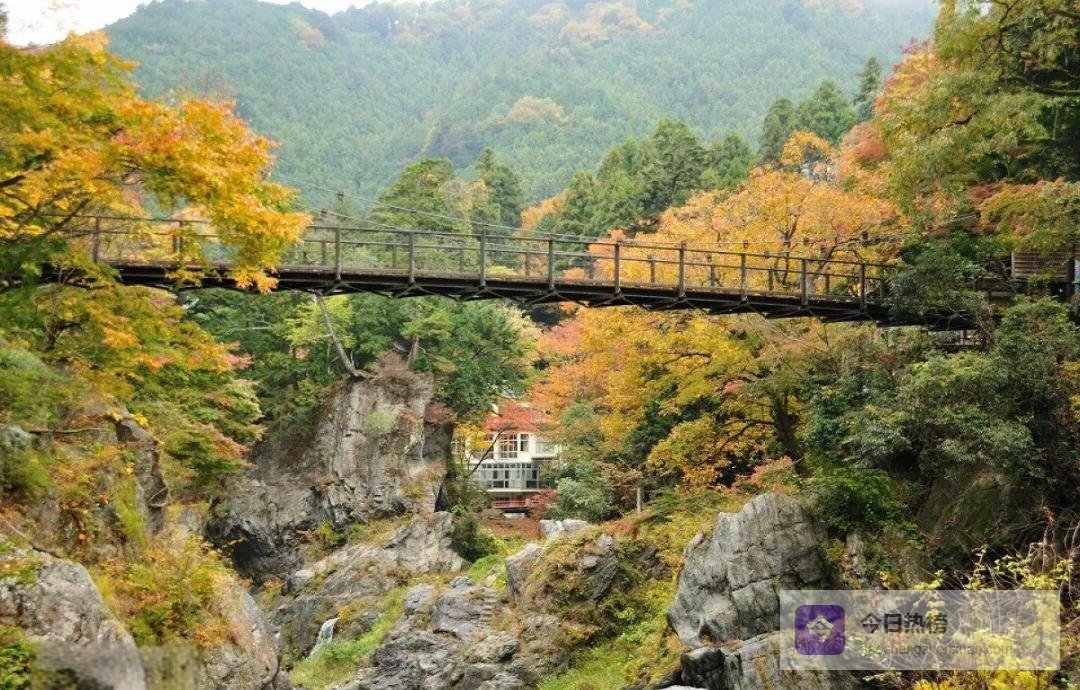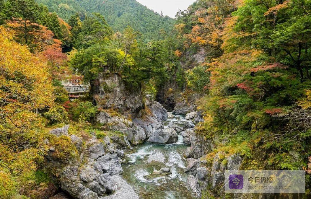 奥多摩町的 鸠之巢溪谷以巨岩闻名,赤红枫叶攀满岩壁,视觉冲击力MAX。沿栈道前行可见“岩鸠”“岩狐”等天然石像,全程免费开放;若想拍巨岩剪影,建议下午4点后到达,光线更侧逆。