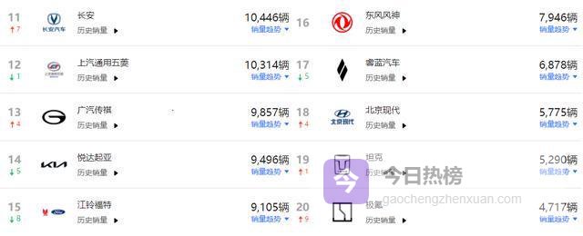 从第11名到第20名,是出口市场的第二梯队。长安汽车10446辆排第十一,上汽通用五菱10314辆排第十二,广汽传祺9857辆排第十三,悦达起亚9496辆排第十四,江铃福特9105辆排第十五,东风风神7946辆排第十六,睿蓝汽车6878辆排第十七,北京现代5775辆排第十八,坦克5290辆排第十九,极氪4717辆排第二十。这个区间里,合资品牌的悦达起亚和北京现代依然有不错的出口量,主要面向母公司所在的韩国市场或其他亚太地区。