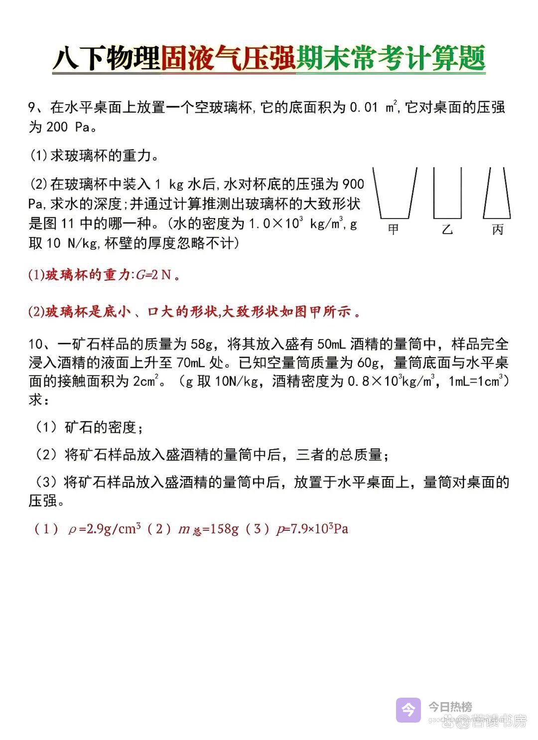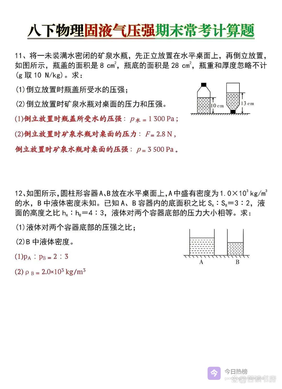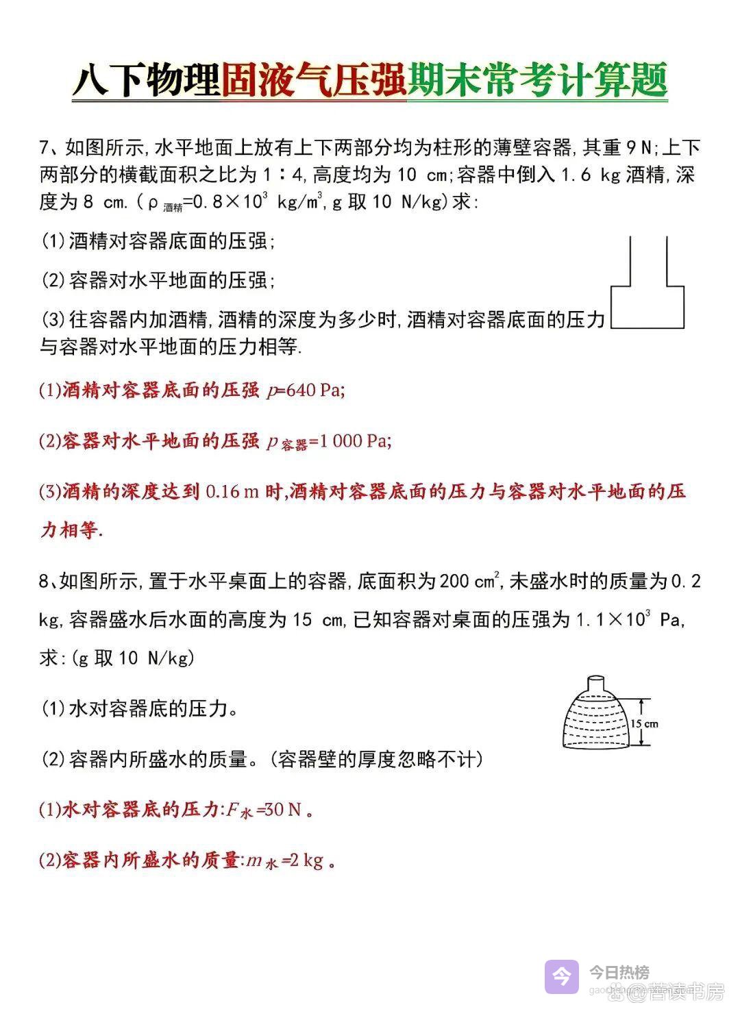 八年级下册物理|固液气压强计算题专练,寒假查漏补缺必刷,开学稳稳拿满分!