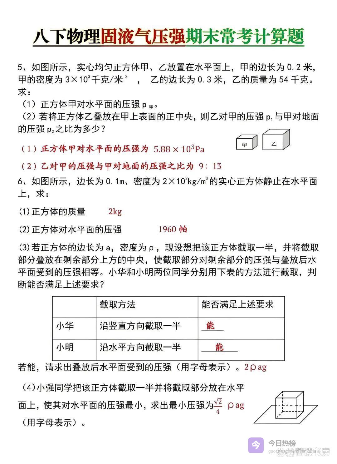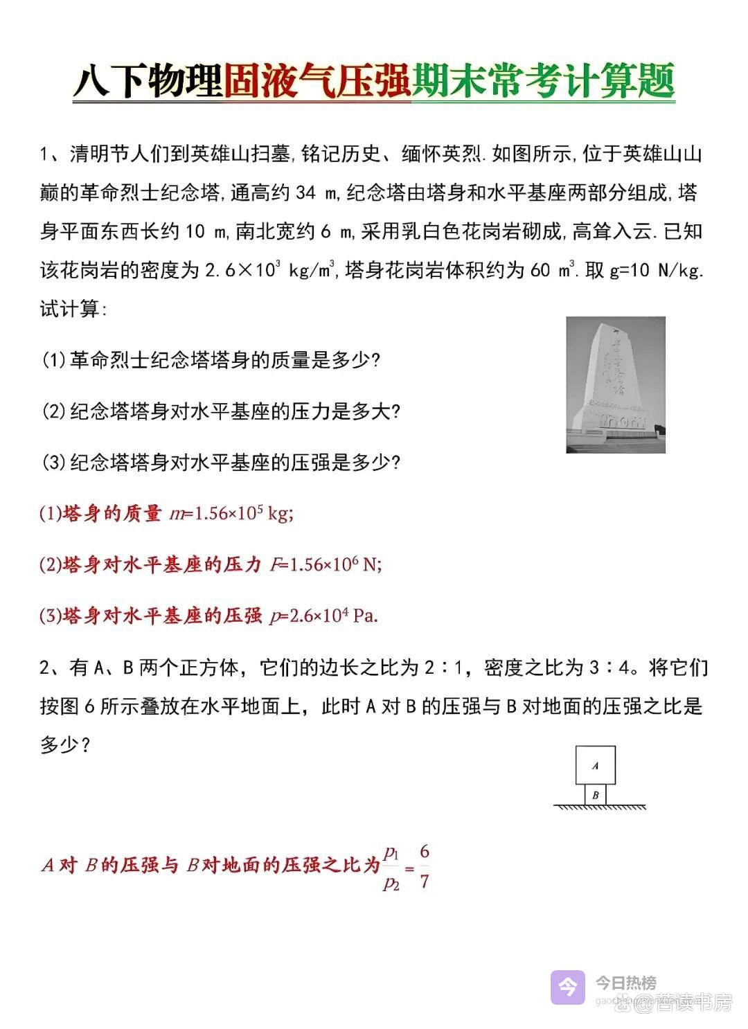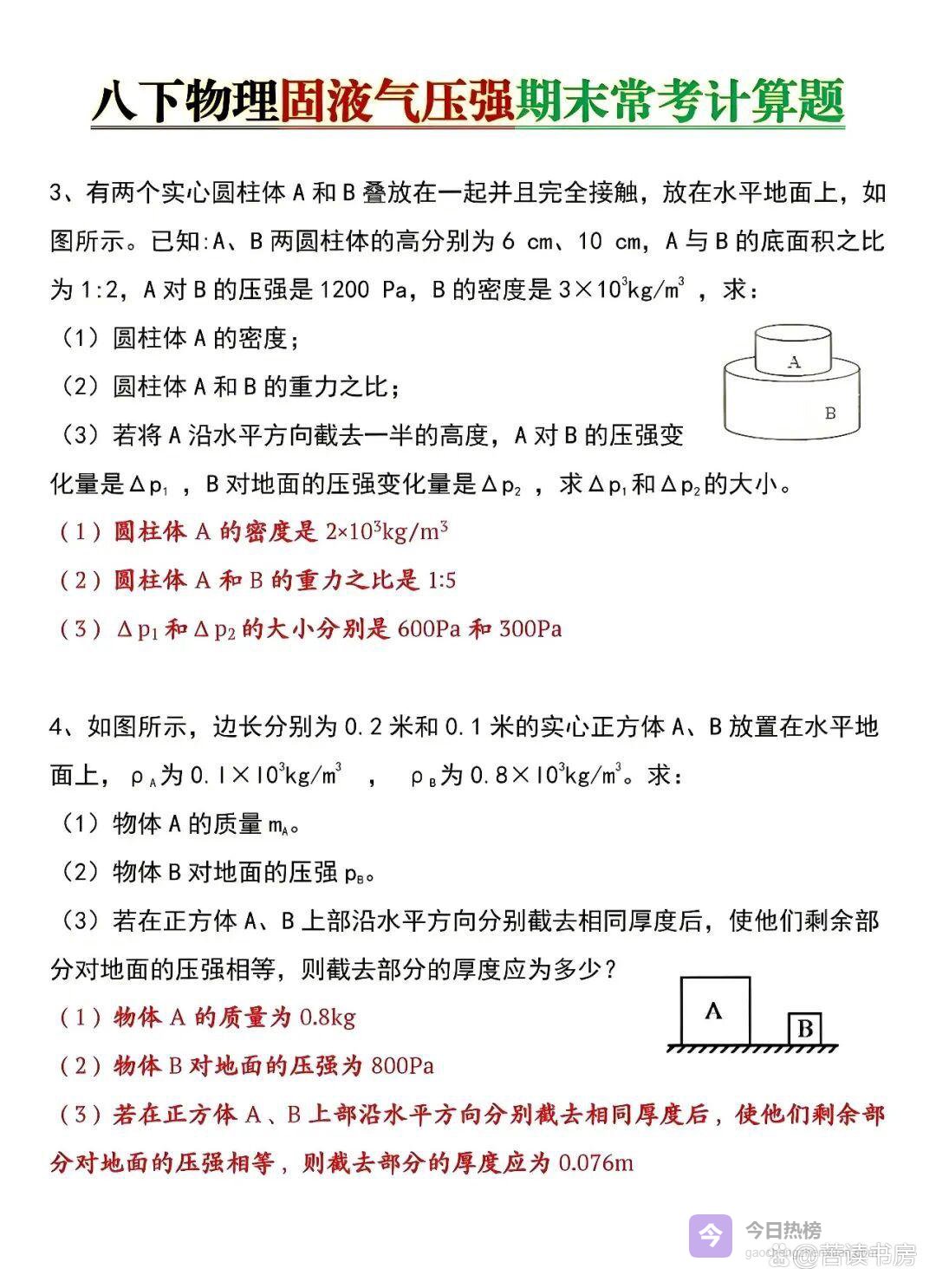 八年级下册物理|固液气压强计算题专练,寒假查漏补缺必刷,开学稳稳拿满分!