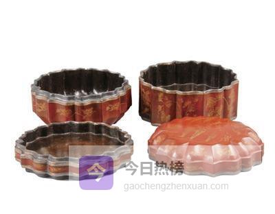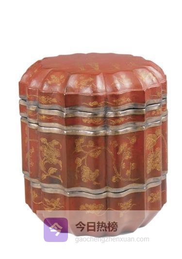 南宋朱漆戗金莲瓣式人物花卉纹奁。