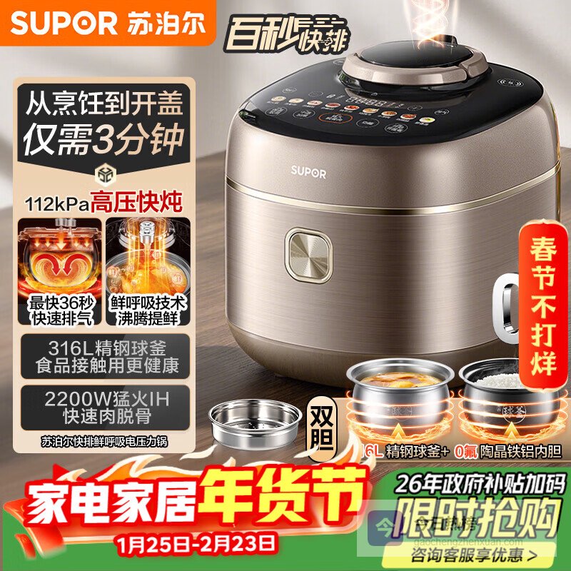 苏泊尔(SUPOR)【厨房好年货】IH快排鲜呼吸电压力锅5L 112kPa 2200W母婴316L球釜高压锅 SY-50FH5018Q 4-6人¥