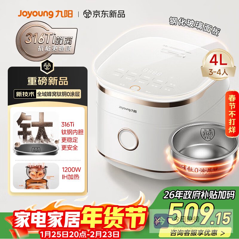 第10款:九阳全域蜂窝0涂层316L钛内胆低糖IH电饭煲4L