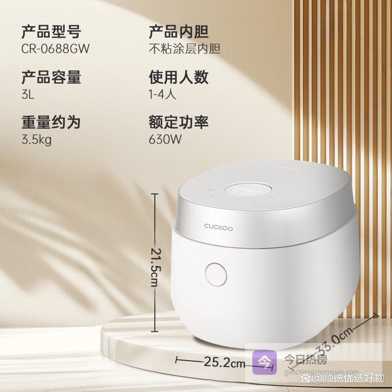 福库作为韩国代表性品牌,其电饭煲一直以“多功能”和“便捷清洁”著称。这款3L容量的产品非常适合1-4人的亚洲家庭。它的特色在于丰富的智能菜单和人性化设计,比如智能预约、定时,以及“上盖可拆卸清洗”功能。后者解决了电饭煲清洁中最令人头疼的卫生死角问题,大大提升了日常维护的便利性。