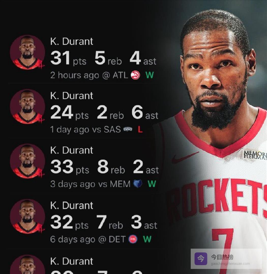 抡冒烟了! 37岁的杜兰特5场狂轰156分,火箭正在“熬”一个老将的极限
