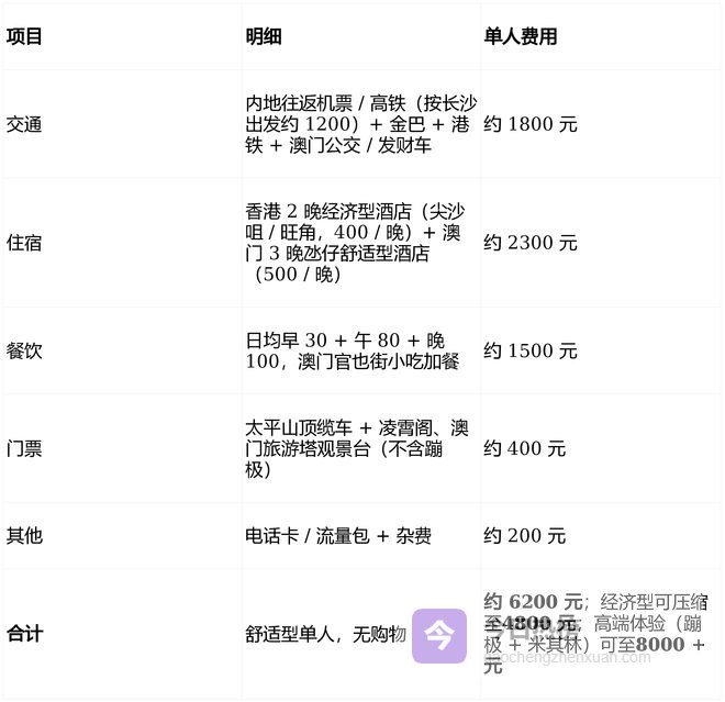证件:提前办港澳通行证 香港、澳门各一次有效签注;支付:香港澳门支付宝 / 微信普及,兑换 500-800 元现金备用;澳门酒店免费发财车优先坐,省打车费;澳门旅游塔:门票提前网购比现场便宜;恐高者只选观景台即可;官也街:避开 12:00-14:00 人流高峰,早上或傍晚去吃更舒服;网络:开通国际漫游或买港澳通用电话卡;