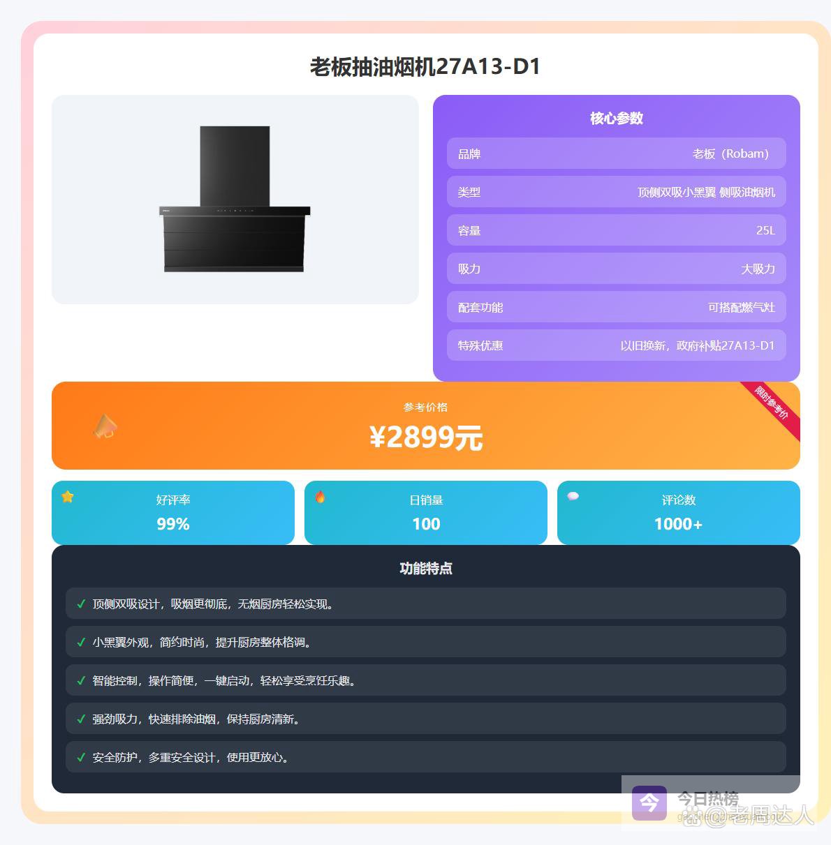 说起高端厨电,老板电器绝对是国产里的金字招牌。但名气大也带来选择困难,它家油烟机型号众多,设计各异,价格从两千到近四千都有。光看商品页,都说自己吸力强、易清洁。“老板油烟机哪款好”这个问题,真不能一概而论。作为一个经常下厨、对油烟零容忍的用户,我深入研究了老板几款主流型号。今天,我们就抛开笼统的参数,从最关乎实际效果的“吸烟腔体设计”、“核心风压与排烟能力”以及“内部清洁技术”这三个硬核维度,帮你分析这三款代表型号,看看哪一款的设计最能“对症下药”,解决你厨房的油烟难题。