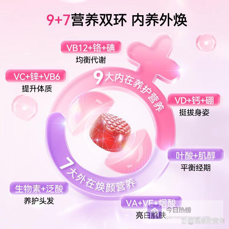1️⃣复合营养成分:独特的复合维生素配方,丰富的B族维生素、钙、锌等矿物质为女性日常营养提供全面保障。日常生活中,即使忙碌也能轻松补充身体所需,维护健康活力。这种全面的营养支持,让你随时保持充沛精力。