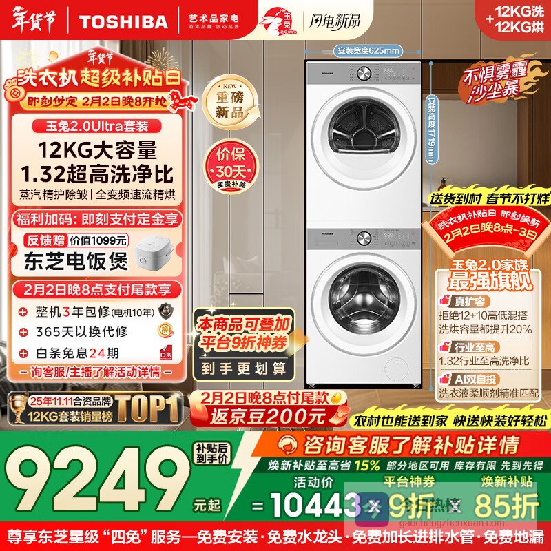 【京东自营】东芝玉兔2.0Ultra洗烘套装12公斤大容量滚筒洗衣机+变频热泵烘干机超微泡全变频蒸汽¥