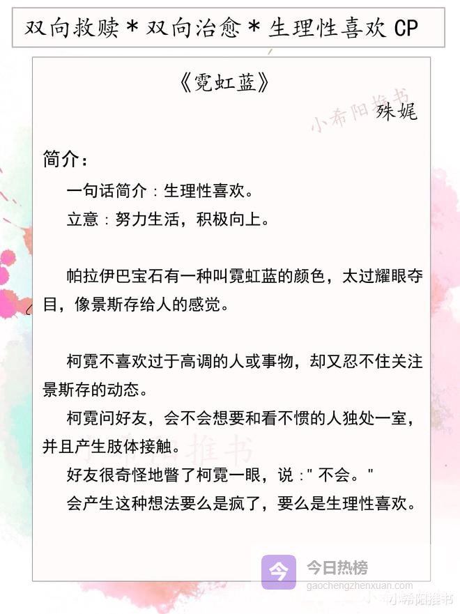 景斯存(男主),则是像帕拉伊巴宝石般耀眼的“霓虹蓝”少年,高调耀眼的天才,小学拿知识竞答亚军,初中斩获脑力节目冠军。温柔男主真的是理想型,男主父亲患病严重,家里失去顶梁柱,后来奶奶也患病,家里的负担男主慢慢扛起来,男主真的是美强惨。