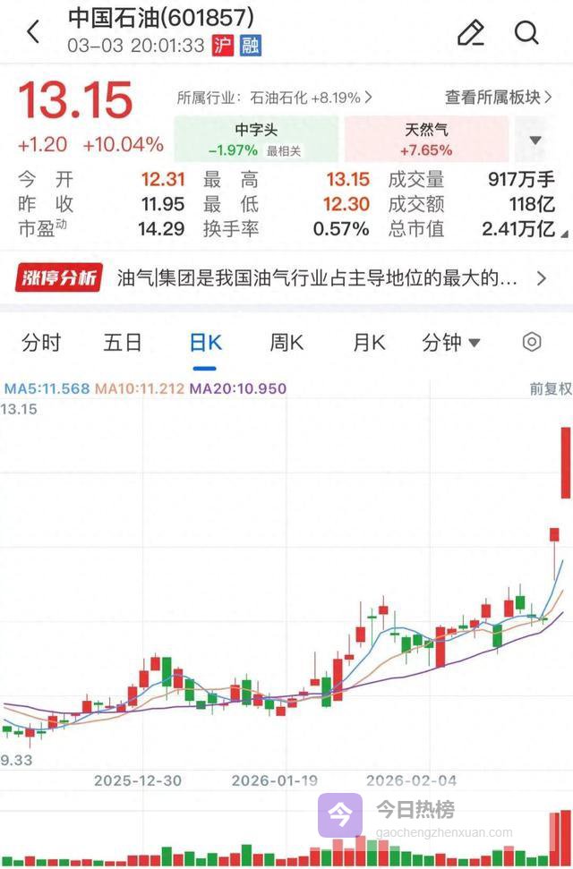 受中东地缘局势的影响,A股油气板块上演罕见大涨行情,近2个交易日,“三桶油”历史上首次集体收获两连板。