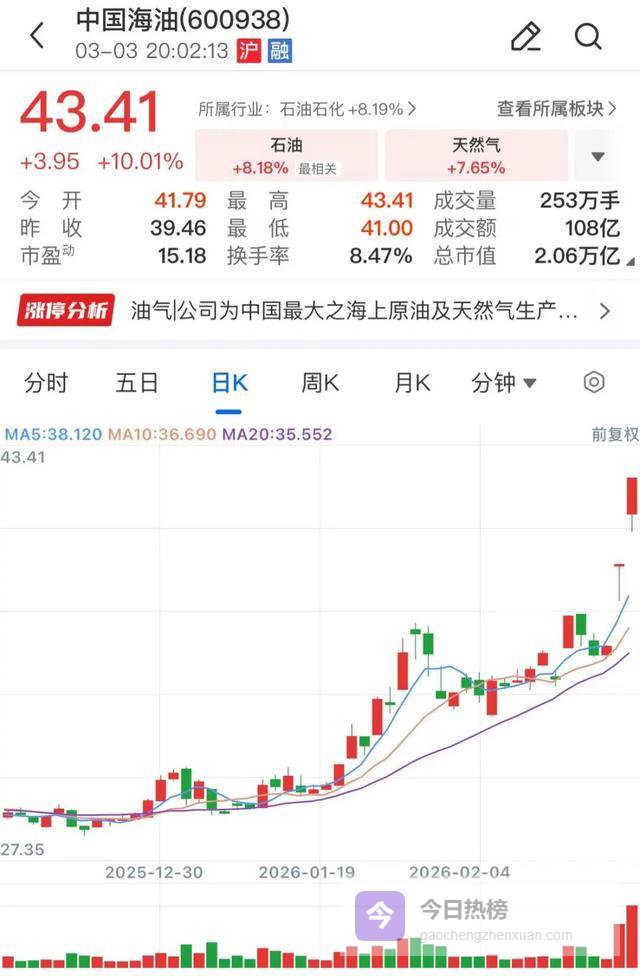 中国海油A股股价近两个交易日同样连续涨停,截至今日收盘,该股报收43.41元/股,总市值20633亿元,今年累计涨幅达43.84%。