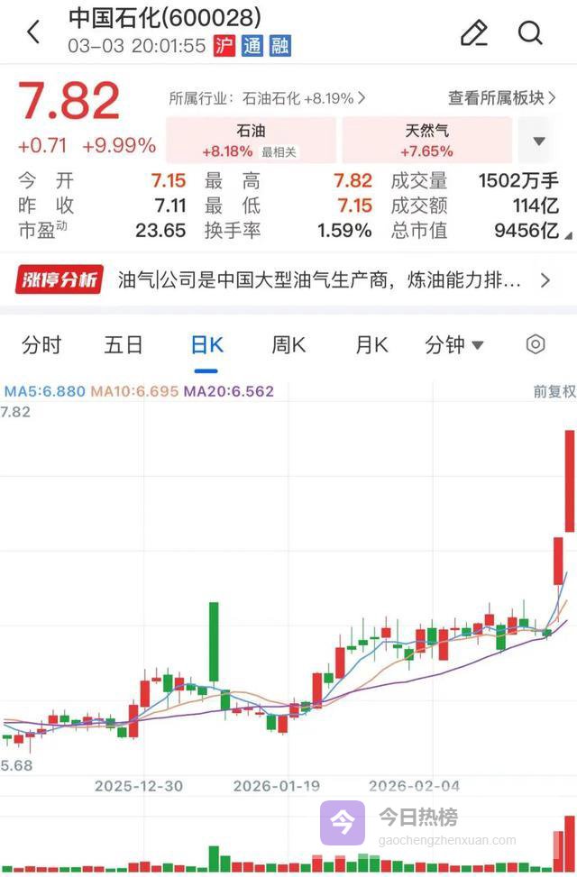 中国石化A股股价近两个交易日连续涨停,截至今日收盘,该股报收7.82元/股,总市值9456亿元,今年累计涨幅达26.54%。