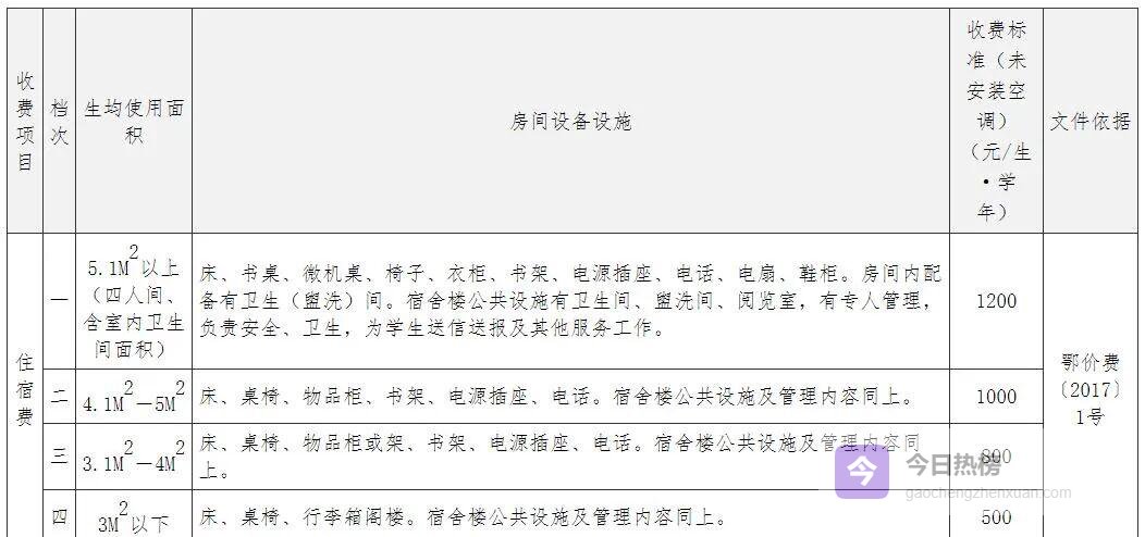 5.1 ◆ 学费与住宿费 公办全日制一二三年级学生全部免学费;住宿按“400元/学年”基准档收费,达标才可上浮;空调间最高加收120—60元/学年。