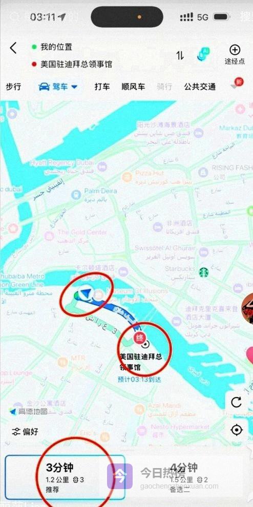 地图定位清清楚楚,酒店就在美国驻迪拜总领事馆附近,车程只要三分钟