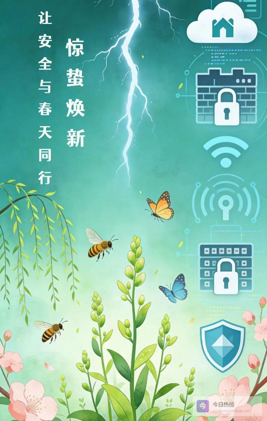 春雷阵阵,万物复苏;惊蛰已至,春意渐浓。随着气温回升、生活生产逐步繁忙,网络活动愈加频繁,网络谣言、网络陷阱、信息泄露等安全风险也随之“抬头”。值此惊蛰节气,温馨提醒广大网民:春雷惊百虫,网安防隐患,绷紧安全弦,守护平安生活。