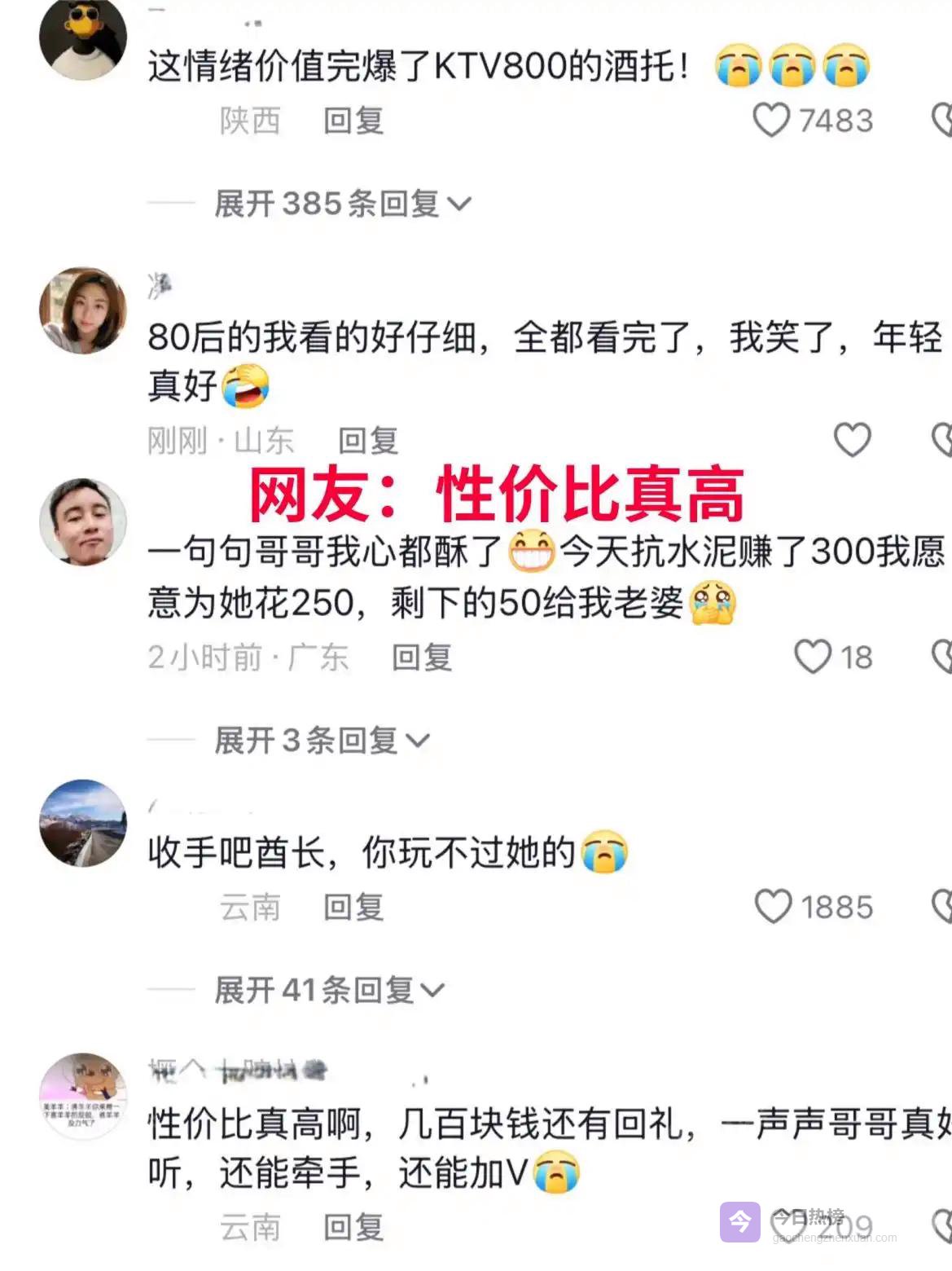 有的人,满心羡慕、嫉妒、恨意交织着叫嚷:“性价比可真是高得很,几百块钱的花费居然还有回礼,那一声声哥哥叫得可真好听,谁能够承受得住这般情况?更不要说还能够牵手了,甚至还能够带回家去,这哪里是女大学生,简直完完全全就是个小妖精!”。