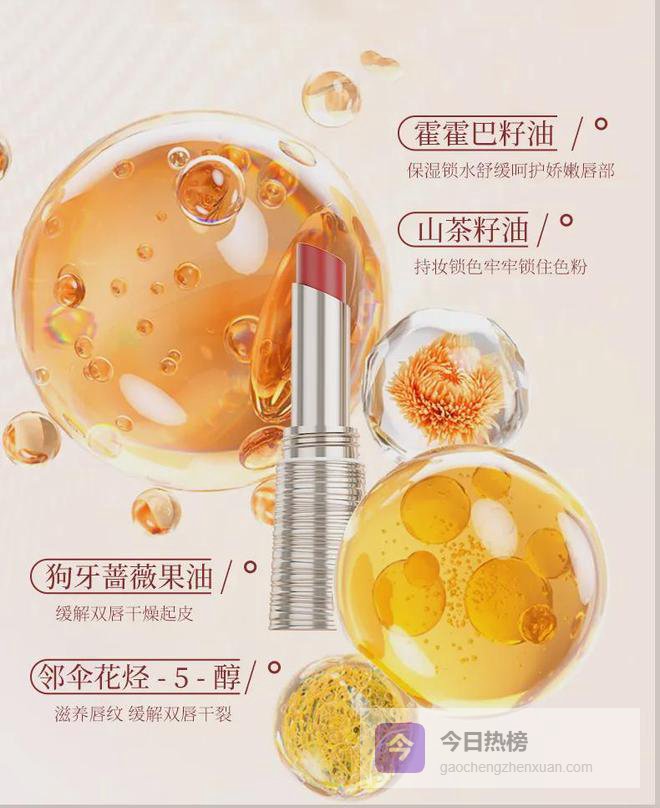 在配方中添加了霍霍巴籽油和山茶籽油。既能深层滋润唇部,缓解干燥起皮,又能在成膜后保持雾面妆感,不会因为滋润而显得油腻。保湿锁水的同时膏体细腻不卡纹,涂完后嘴唇柔软饱满,一整天都不会有紧绷感。