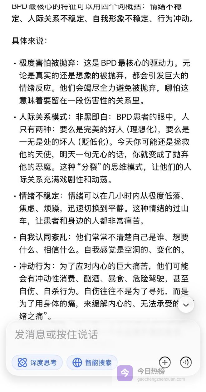 比如,事情是从A发展到B再发展到C再到D的,但她如果是处于D环中她自认为被伤害的位置,ABC情节会被她自动忽略。别人都是品德低劣,才突然发疯针对她的。