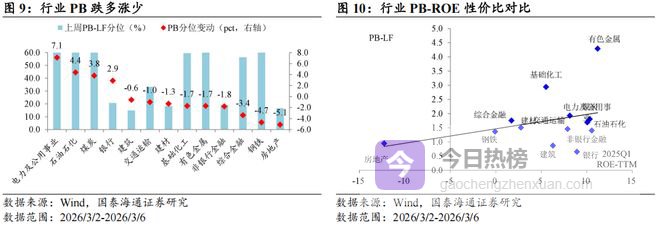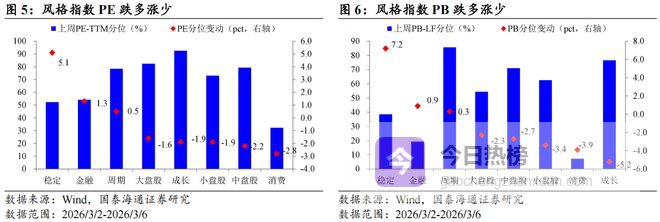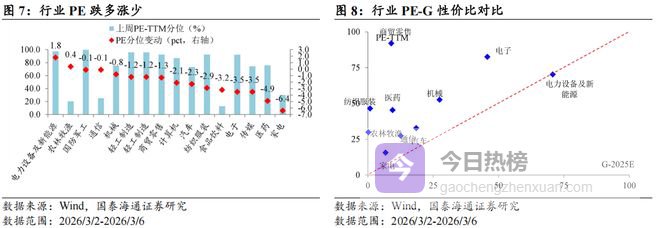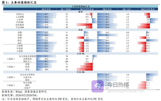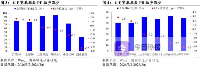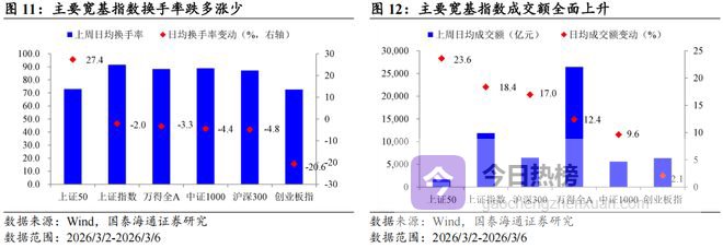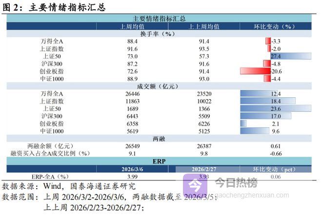 核心观点:上周(2026/3/2-2026/3/6)成交活跃度下降,沪深300领涨。宽基指数:估值跌多涨少,沪深300领涨。行业指数:PE估值电力设备及新能源,PB估值电力及公用事业领涨。情绪:交易活跃度下降,换手率跌多涨少,成交额全面上升。ERP:环比上升。