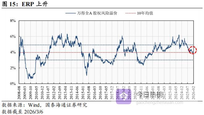 ▶ERP:环比小幅上升。万得全A风险溢价为3.99%,较2026/2/27上升0.06个pct。注:文中估值变动比较为2026/3/5相较2026/2/27;换手率、成交额变动比较为上周(2026/3/2-2026/3/6)均值相较上上周(2026/2/23-2026/2/27)均值。