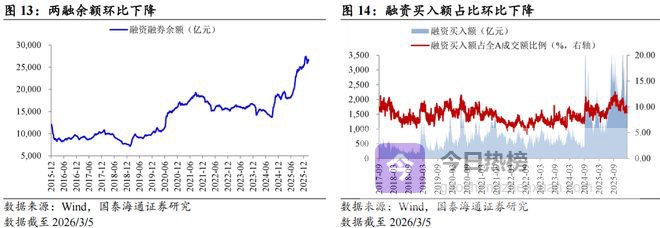 ▶情绪:交易活跃度下降,换手率跌多涨少,成交额全面上升。换手率:各指数跌多涨少,上证50涨幅最大,领涨27.4%。成交额:各指数全面上升,上证50涨幅最大,领涨23.6%。两融余额:截至2026/3/5,两融余额2.65万亿,相较2026/2/27下降0.65%。融资买入额占比:截至2026/3/5,融资买入额占全A成交额比例9.11%,相较上周均值下降0.66个百分点。