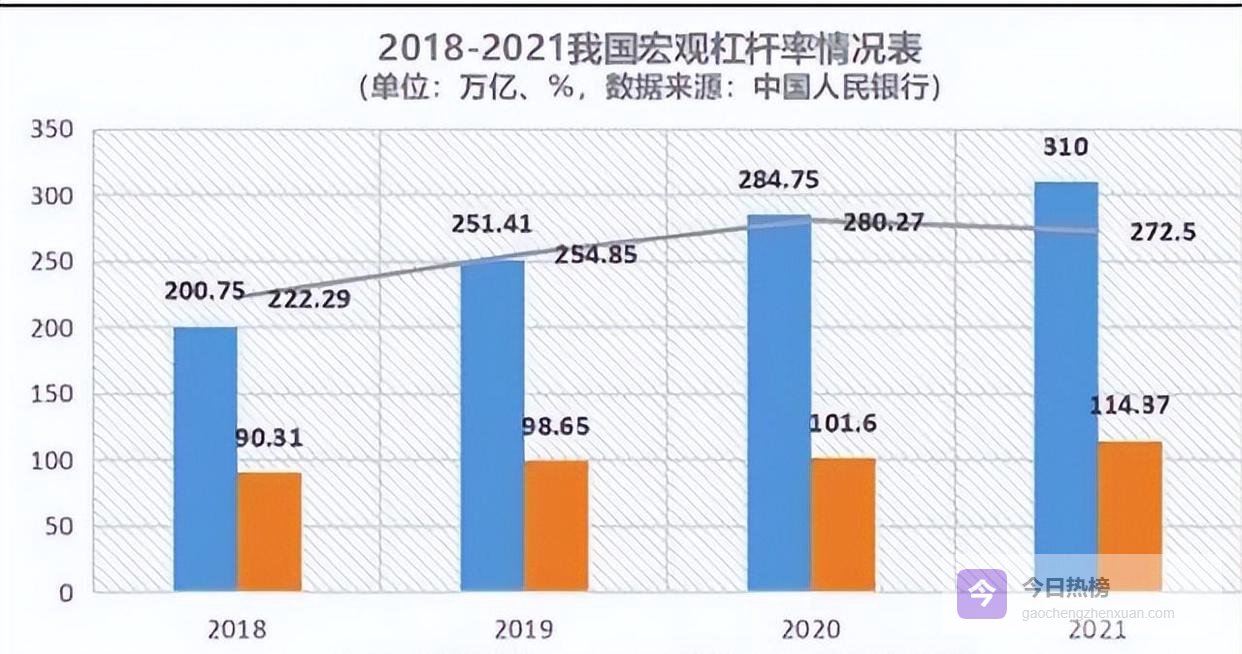 宏观杠杆率这个概念,并不是专门给普通人看的,它是经济学里的一个比值,公式很简单:宏观杠杆率等于全社会债务总额除以当年国内生产总值。2021年,中国的名义GDP大约是114万亿元人民币,用272.5%去乘,就得出了大约310万亿元的全社会债务规模。