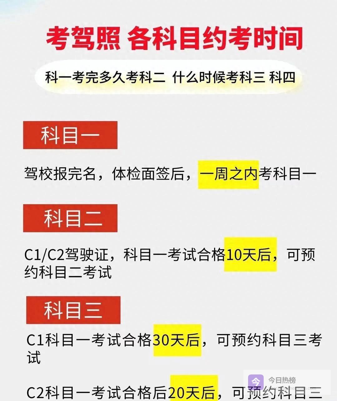 科目一→科目二:科一考完必须满10天才能约科二,约上后一般再等7天考试,最少17天才能上考场。