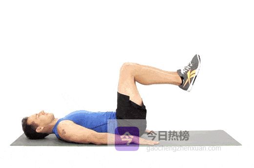 平躺在垫子上,双手放身体两侧,双腿屈膝抬起,大腿与地面垂直,小腿平行地面。呼气时用下腹力量将臀部抬离地面,膝盖向胸口靠近,感受下腹收缩。吸气时缓慢控制还原,但下背部不要完全贴地,保持轻微张力。每组进行12~16个,做3组。