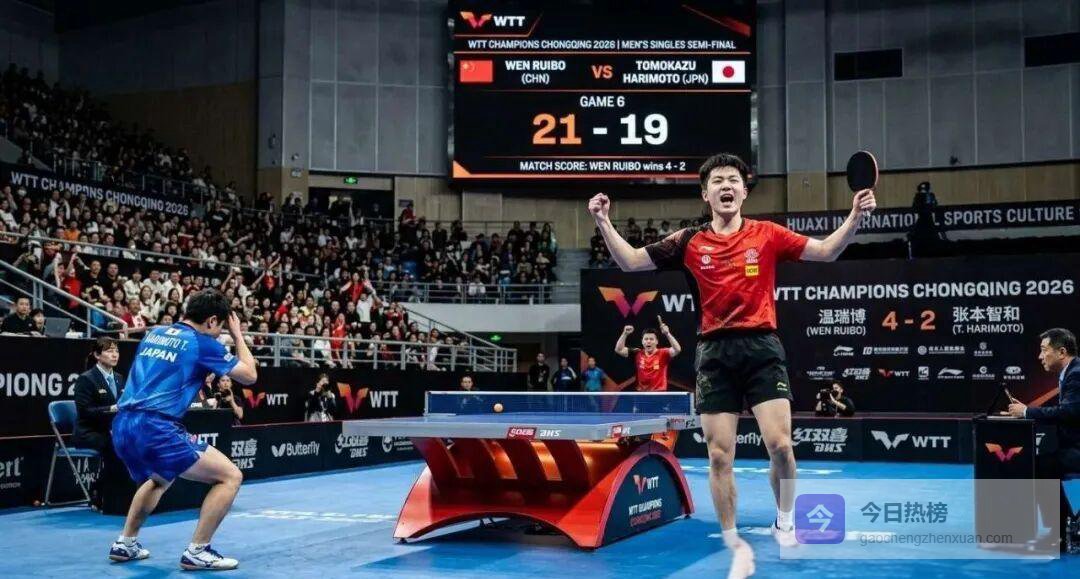2026年WTT重庆冠军赛男单半决赛,持外卡出战的温瑞博与世界排名第四的张本智和首次在成人赛场交锋。六局比分悬念迭起:6-11、15-13、11-5、7-11、11-7、21-19,温瑞博在决胜局挽救五个局点,并在18-19落后时连得三分,最终以21-19锁定胜利,首次跻身该项赛事男单决赛。