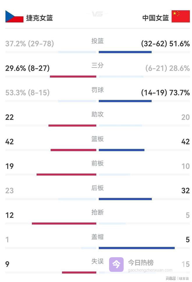 数据看起来有点奇怪,中国队投篮命中率达到51.6%,捷克队只有37.2%,盖帽是5比1,但失误有15次,篮板数差不多,助攻还少两次,