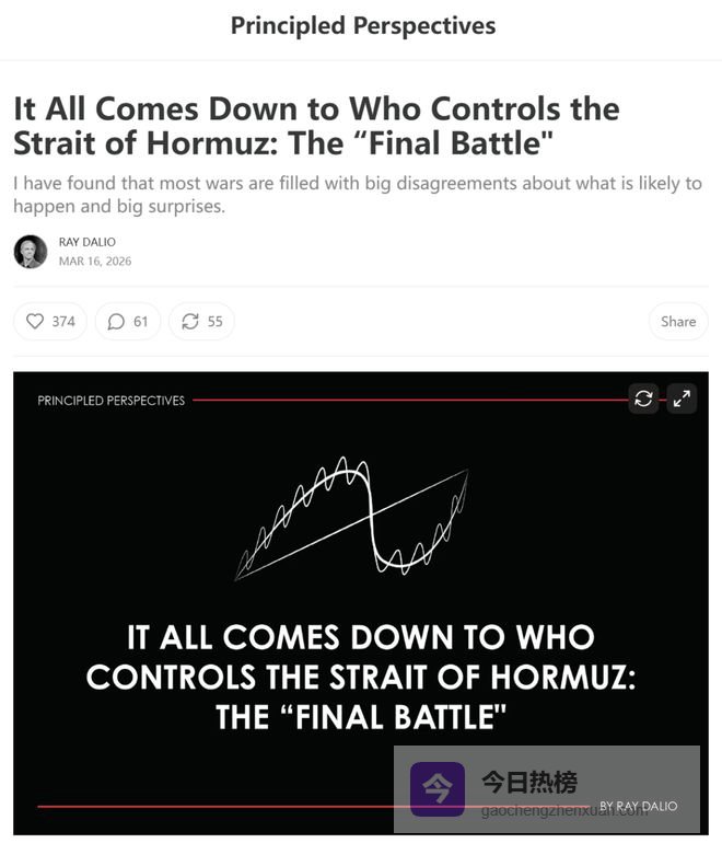 3月16日,全球最大对冲基金桥水创始人瑞·达利欧就当前中东战事发文称,“美国和伊朗当前在霍尔木兹海峡的争夺,将是一场‘终极决战’”。