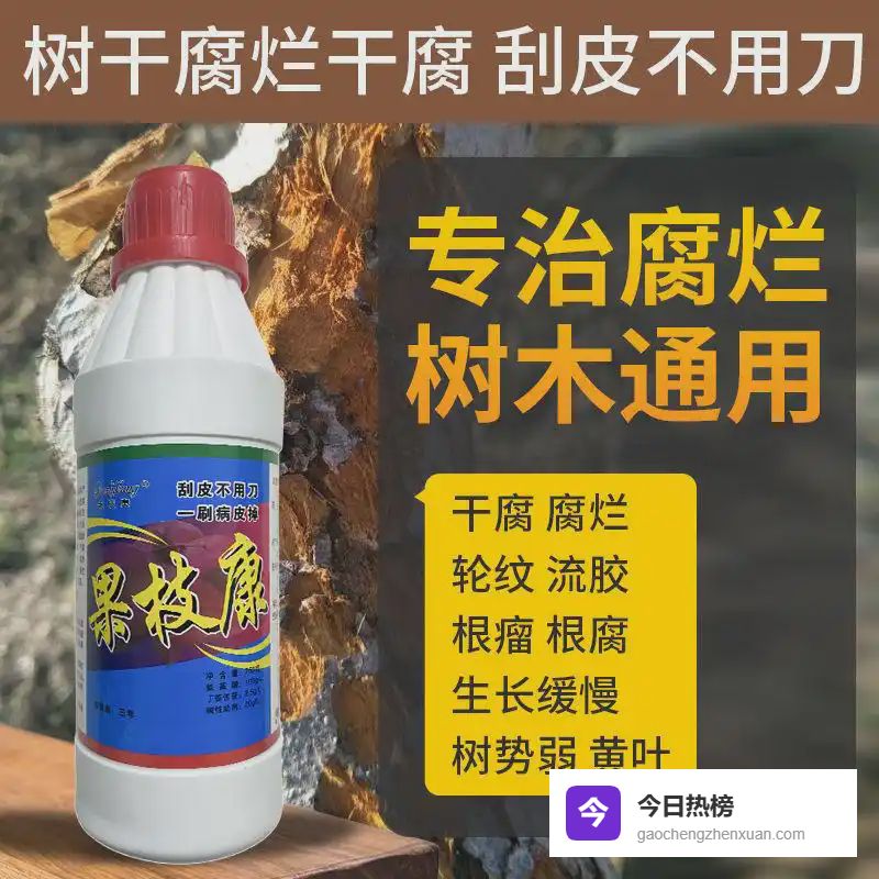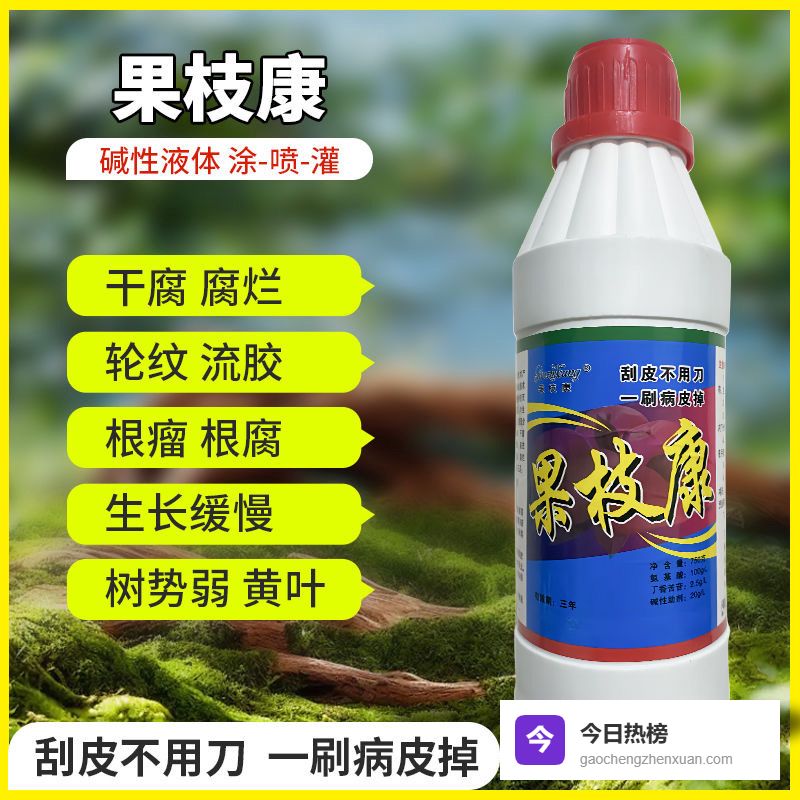 四、果树病害的"全科医生"1️⃣ 一瓶解决八大病害果枝康液体药剂堪称果树界的"瑞士军刀",对轮纹病、腐烂病等常见病害有立竿见影的效果。其碱性配方不仅能杀菌,还能中和病菌分泌的酸性毒素,修复受损树皮。
