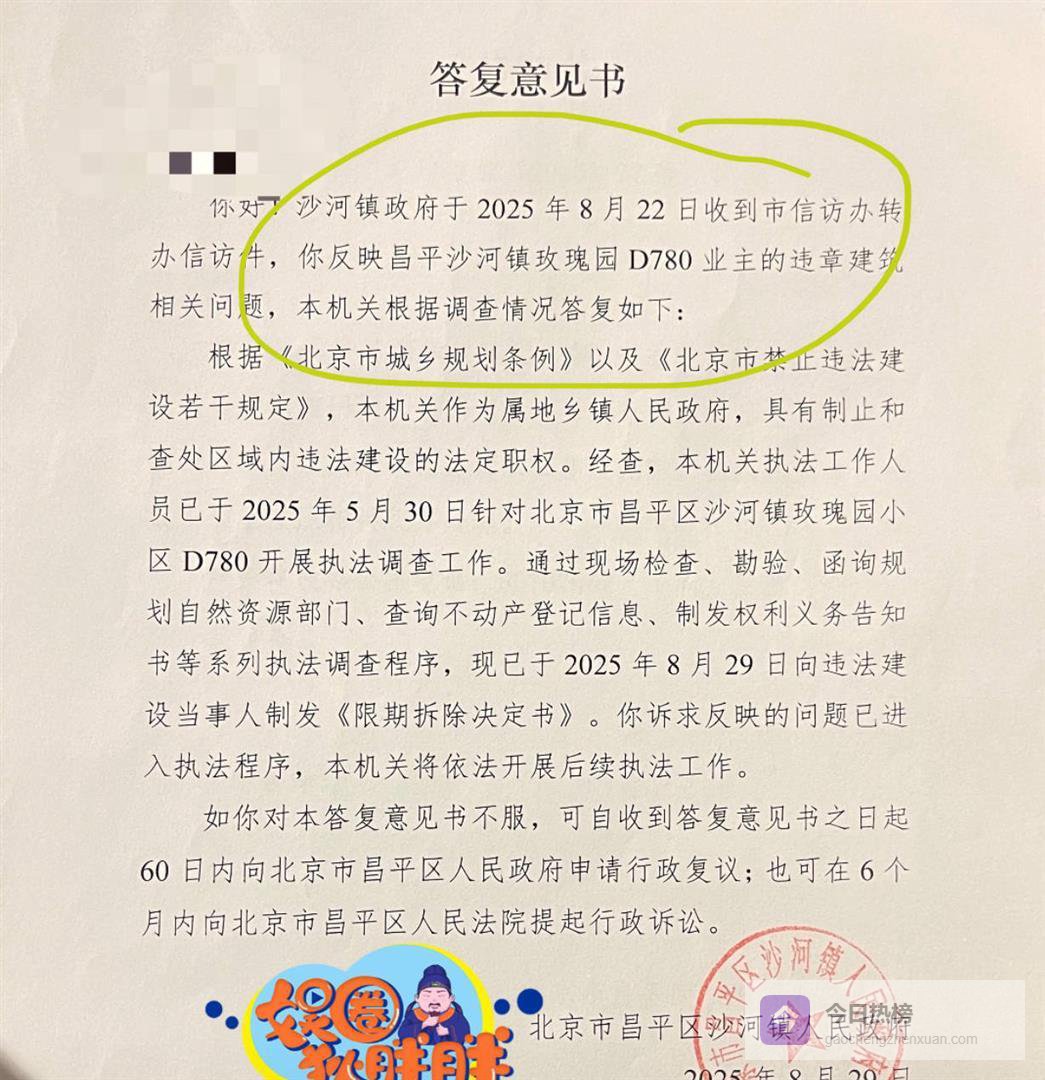 但官方文件显示,投诉是通过市信访办转办的。 答复意见书里明确写着,经过调查,违法建设事实成立。