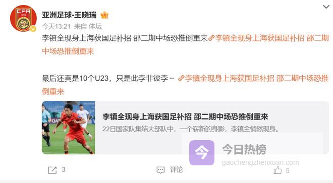北京时间3月22日,足协公布新一期国足26人名单后,归化球员塞尔吉尼奥突然被爆出或退出国足的消息。而在今天,邵佳一也紧急补招了重庆铜梁龙中场球员李镇全作为补充;李镇全此前已经入选安东尼奥执教的U23国足,他被邵佳一补招后,也将引发连锁反应,安东尼奥需要重新补招一人。