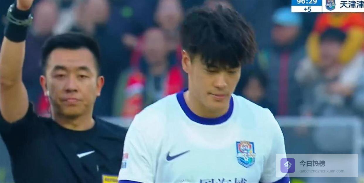 比赛进入伤停补时阶段,天津津门虎再遭打击。 第90+8分钟,津门虎后卫王献钧在禁区内拉倒了铁人前锋田玉达。 主裁判第一时间没有表示,但在VAR介入并亲自回看后,改判点球,并向王献钧直接出示红牌将其罚下。 辽宁铁人队长邦本宜裕站上点球点,他冷静地踢出一记“勺子”点球,骗过门将,将比分最终锁定为3比0。