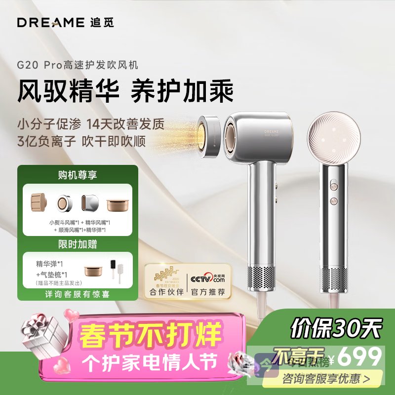 2、护发精华,修护受损:这款吹风机搭载了G20 Pro精华弹,全新升级,从根源解决秀发受损问题。它含有小分子椰子油精华和神经酰胺,深入渗透发芯,帮助毛囊蛋白质再生,提升发丝柔顺度136%。而且,它还有3亿铂金负离子,可以提升顺滑效果,让你的秀发柔顺有光泽。