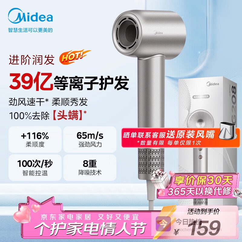 美的(Midea)高速吹风机 39亿等离子护发 杀菌除头螨电吹风 家用负离子护发吹风筒FG208银 新年礼物 情人节礼物¥