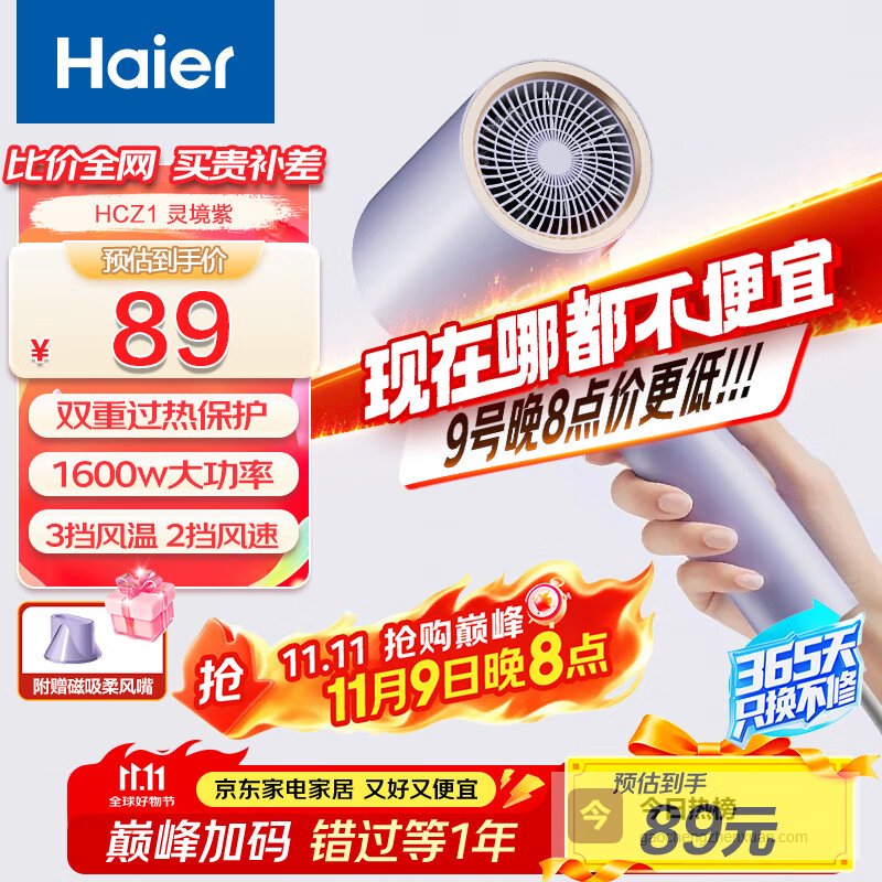 海尔(Haier)电吹风学生家用大功率护发大风量便携吹风机送女友【520礼物】 HCZ1灵境紫 8千万负离子 磁吸风嘴¥
