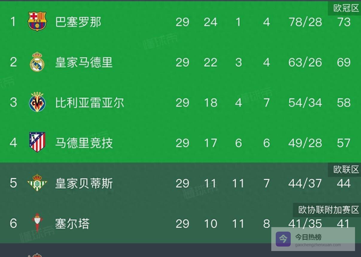 西甲第29轮全部结束后,积分榜的格局基本明朗。巴萨、皇马、比利亚雷亚尔、马竞占据了前四名,欧冠资格的争夺同样激烈。但所有人的目光都聚焦在冠军争夺上,这场德比的结果让悬念得以延续。