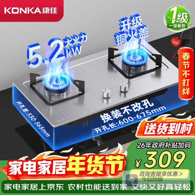 康佳(KONKA)燃气灶煤气灶双灶具家用 5.2kW大火力内铜火盖嵌入式台式 防爆不锈钢 JZT-G420Y(DH35)(天然气)¥