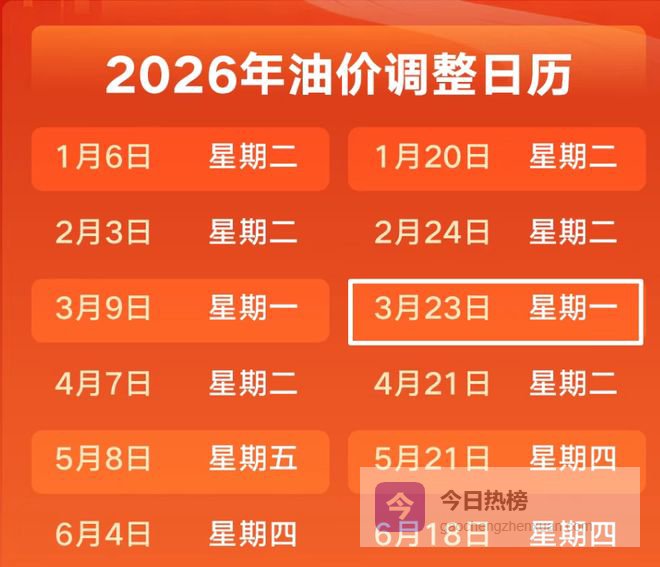 今日油价消息:3月22日,新一轮油价统计周期内的第9个工作日,预测汽柴油上调2030元/吨(下周一涨幅或将进一步增加),折算为1.62-1.77元/升。