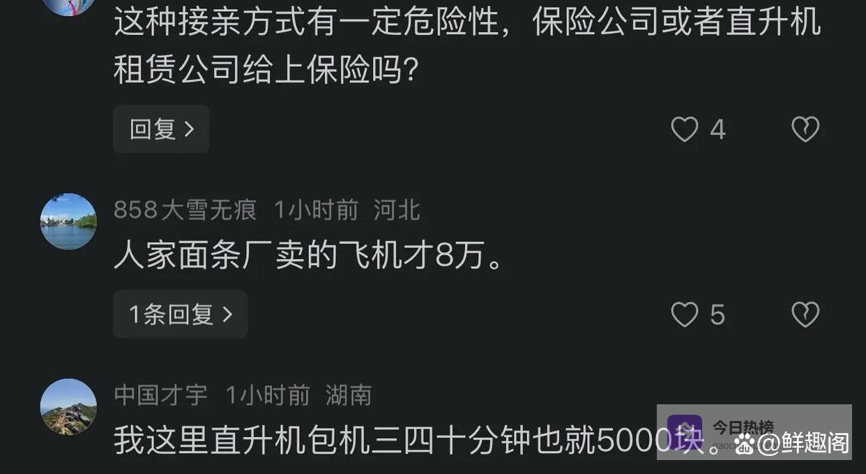 这场太原直升机婚礼的视频曝光之后,评论区很快就充满了各种幽默反应,简直让人笑翻了。一位网友说,其实还不如用挖土机,让他们站在挖斗里,然后高高举起,这不也是在空中吗?还有网友调侃,坐火箭也可以,一分钟就到家了。另有一位网友开玩笑,面条厂的飞机才八万,不如自己买一架。