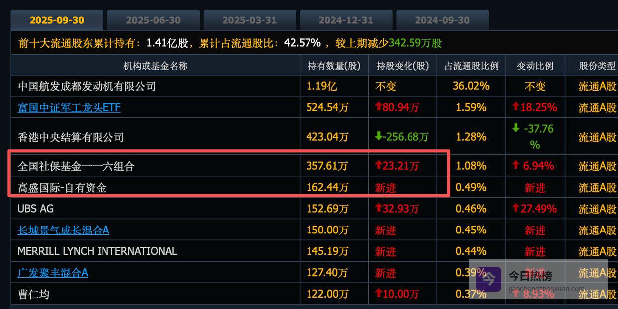 航发科技,社保基金116组合刚刚加仓到358万股,高盛新进162万股,都是买进十大股东的。