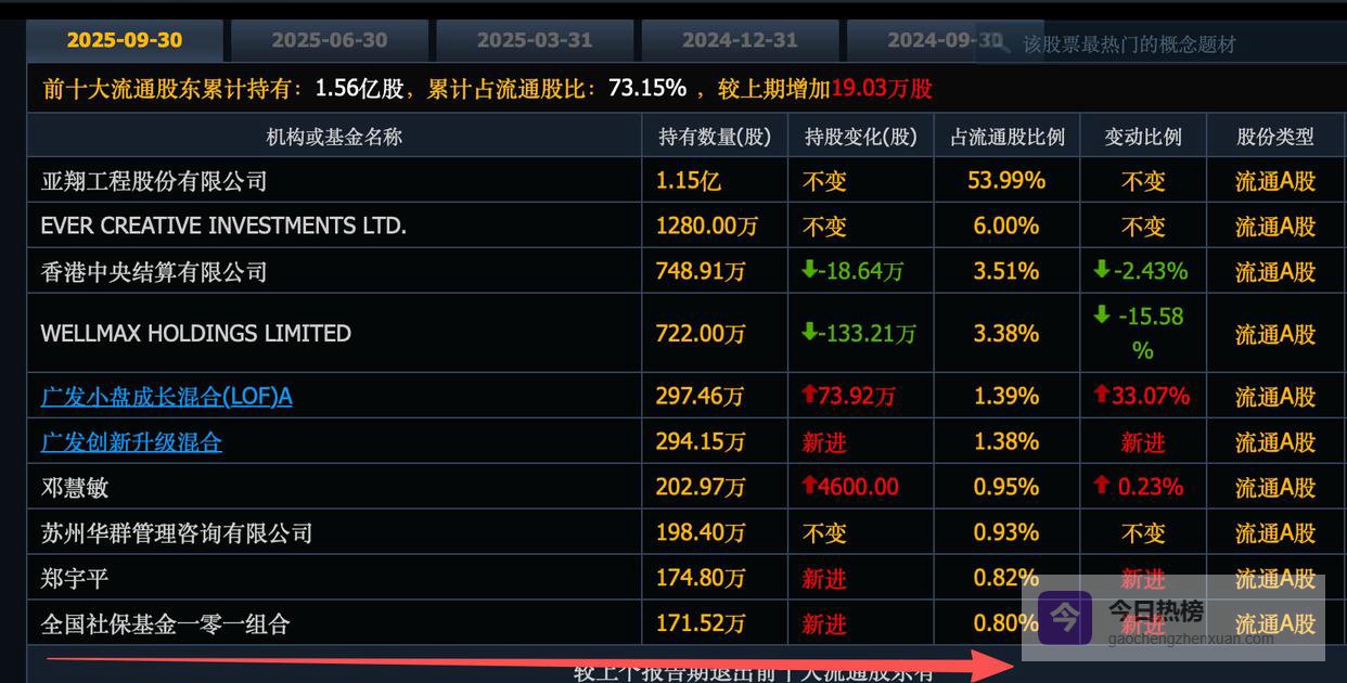 亚翔集成,社保基金101组合刚刚新进了172万股,位列第十大股东。