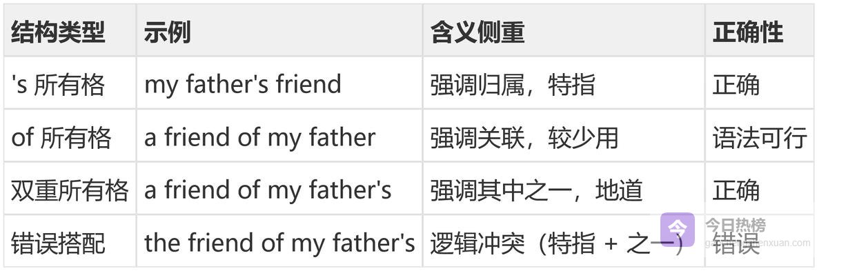 双重所有格,即"of + 's"或"of + 名词性物主代词"的结构。很多读者困惑,既然有了"of",为什么还要加"'s"?这涉及到英语对"归属"概念的精细划分。